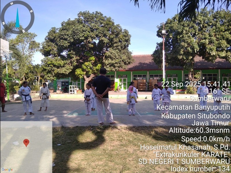 Siswa SD Negeri 1 Sumberwaru ikut dalam Kegiatan Ektrakurikuler Karate yang dilaksanakan di lapangan Sekolah yang dipandu oleh pelatih.